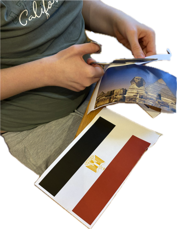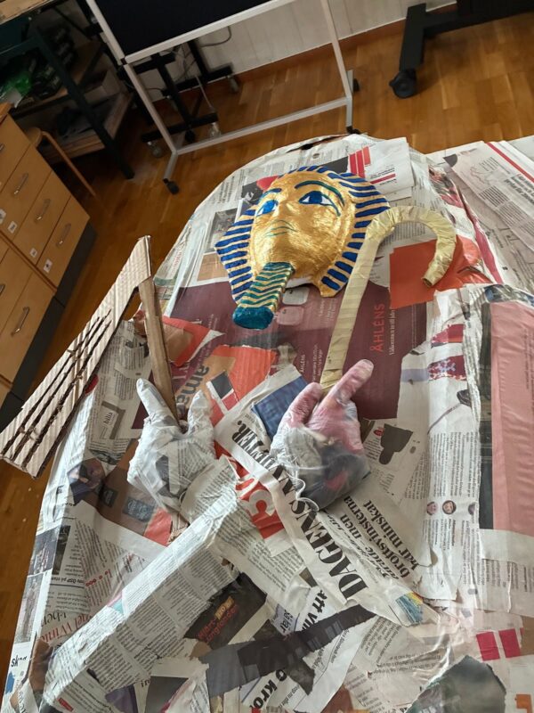 Vi fortsätter skapandet i skolan och i bildsalen växer Tutankhamuns sarkofag fram. Otroligt bra gjord i papier mache och guldfärg. Eleverna tillverkar också material som ska utforma scenen och har nu fått inspiration från olika utflykter förra året och under nuvarande termin.